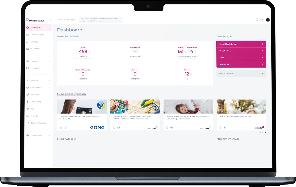 Anbindung an fünf Social-Media-Kanäle und das Google Unternehmensprofil deiner Praxis. Veröffentliche deine Beiträge mit nur einem Klick auf sechs Kanälen gleichzeitig!