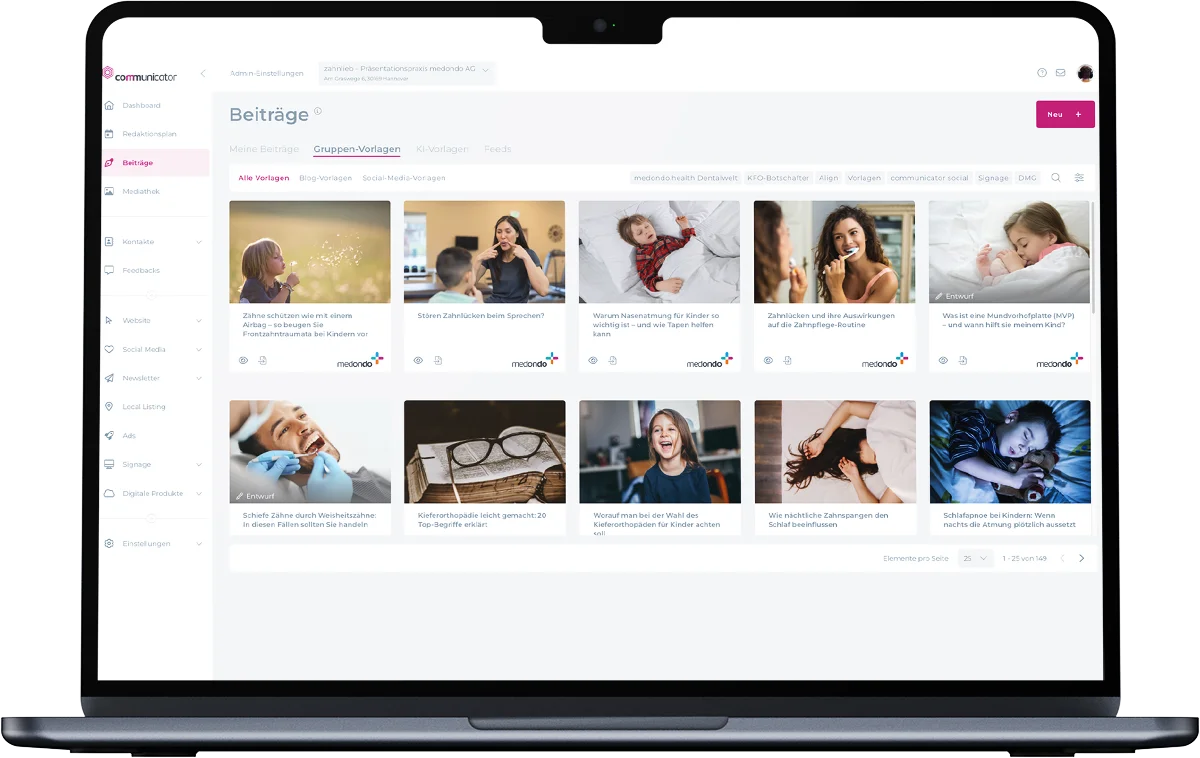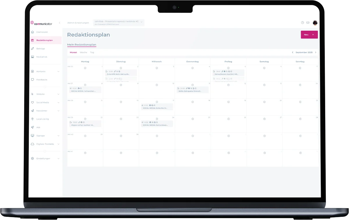 - Fachinhalte auf Ihrem Praxisblog in einem Redaktionsplan einplanen, und automatisch veröffentlichen können. Dadurch erhöhen Sie die Sichtbarkeit Ihrer Praxis und sorgen für eine umfassende Patient:innenaufklärung.